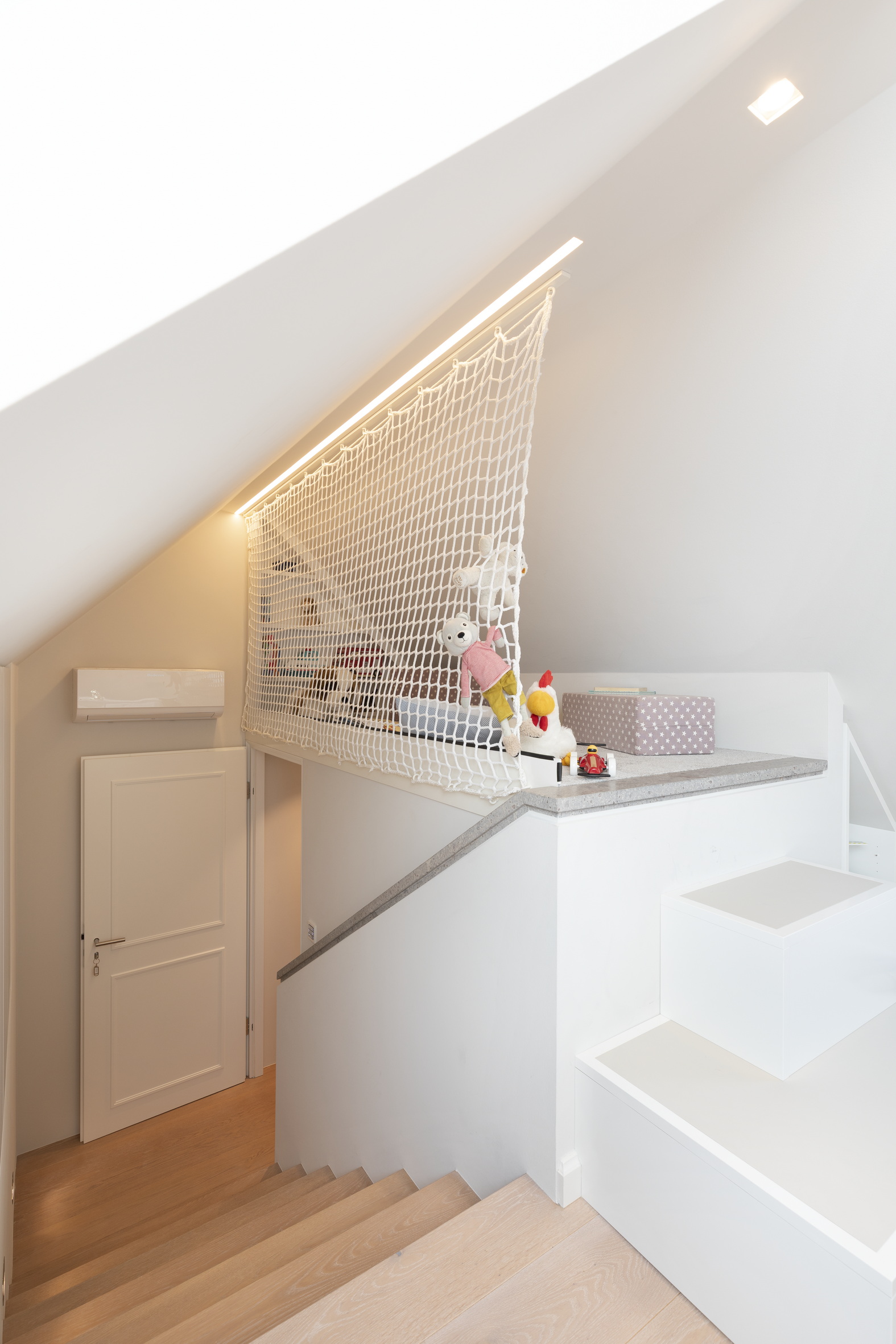 In einer großzügigen Familienvilla blieb der Dachraum über Jahre hinweg ungenutzt. Ein offenes Volumen mit geringer Raumhöhe und ohne klare Funktion bot jedoch das Potenzial für neuen Wohnraum. Ziel des Umbaus war die Entwicklung eines vollwertigen Kinderzimmers, ohne die bestehende Dachkonstruktion grundlegend zu verändern. Die geringe Deckenhöhe stellte die größte Herausforderung dar und ließ sich konstruktiv nicht anpassen. Zwei großzügige Dachflächenfenster, die als aus der Dachfläche hervortretende Elemente ausgebildet sind, verbesserten die räumliche Situation deutlich. Sie vergrößern den nutzbaren Stehbereich und bringen viel Tageslicht in den Raum. Gleichzeitig entsteht eine intensive visuelle Verbindung nach außen. Der freie Blick in den Himmel und die umliegenden Baumwipfel verleiht dem Zimmer eine unerwartete Weite und Leichtigkeit. Eine filigrane Stahlkonstruktion trennt den neuen Raum klar vom Treppenraum und trägt eine zusätzliche Ebene. Diese Ebene dient als Schlaf- und Spielempore und nutzt die vorhandene Raumhöhe optimal aus. Darunter entsteht ein klar strukturierter Bereich, der dem Kinderzimmer zusätzliche Nutzungsqualitäten...