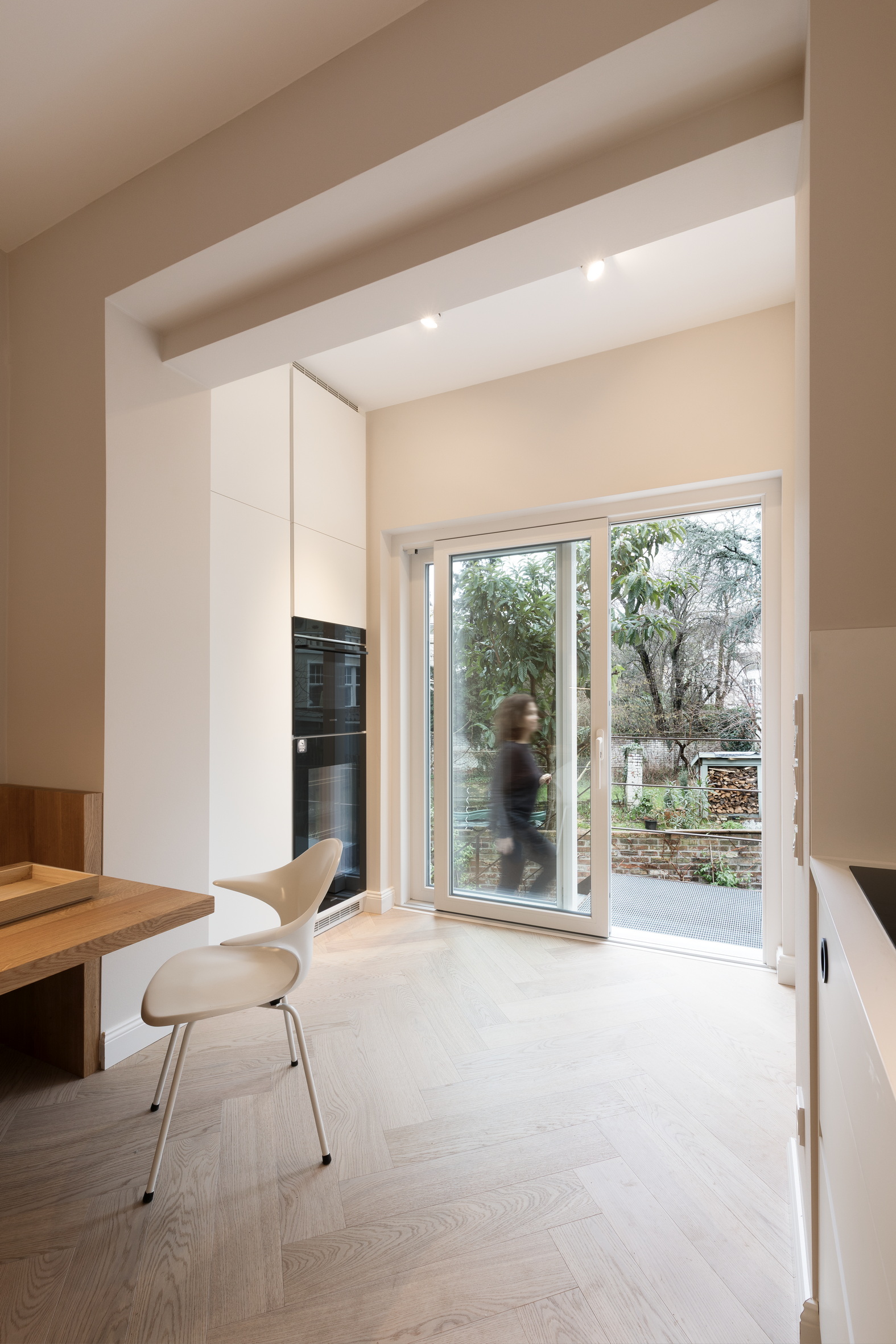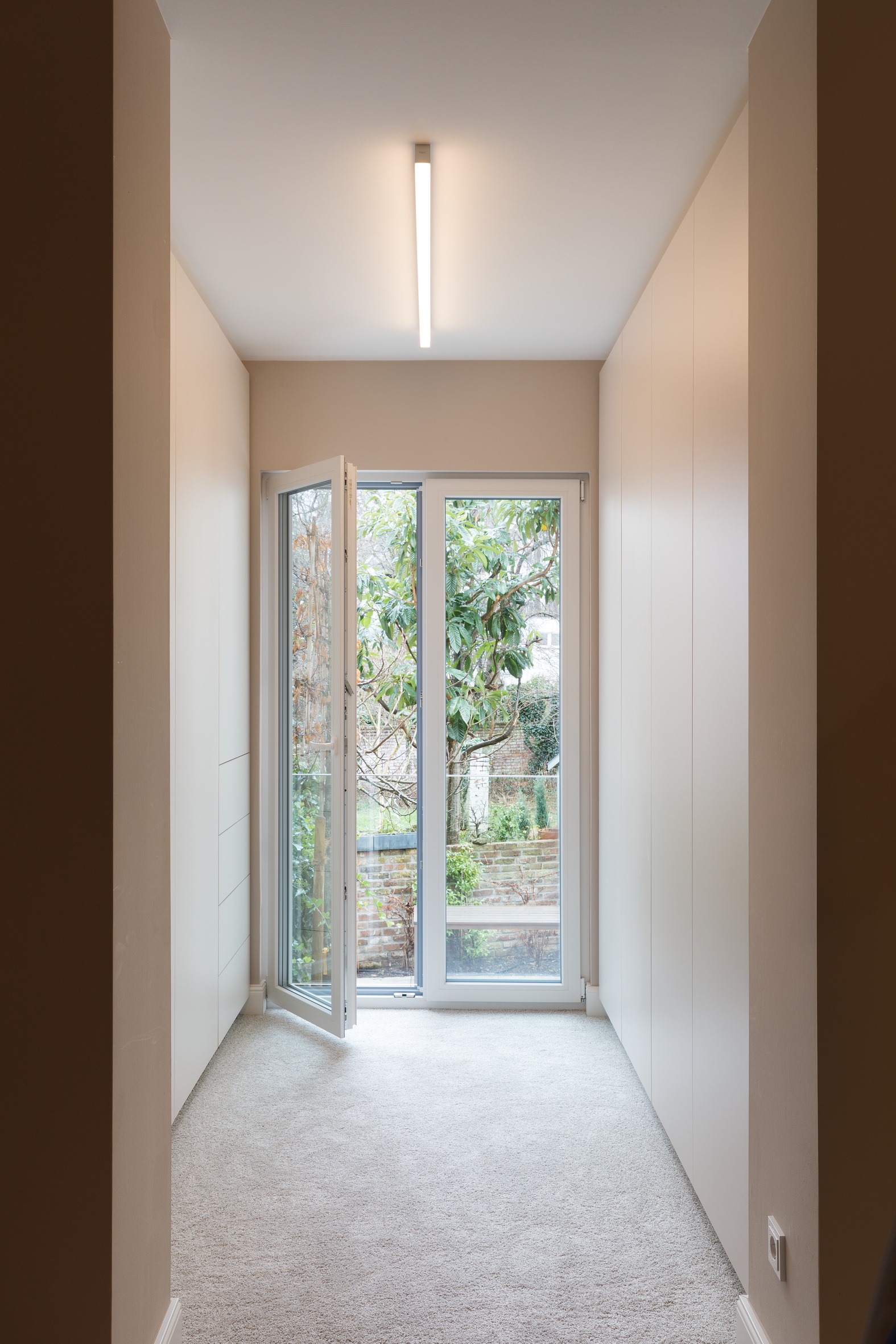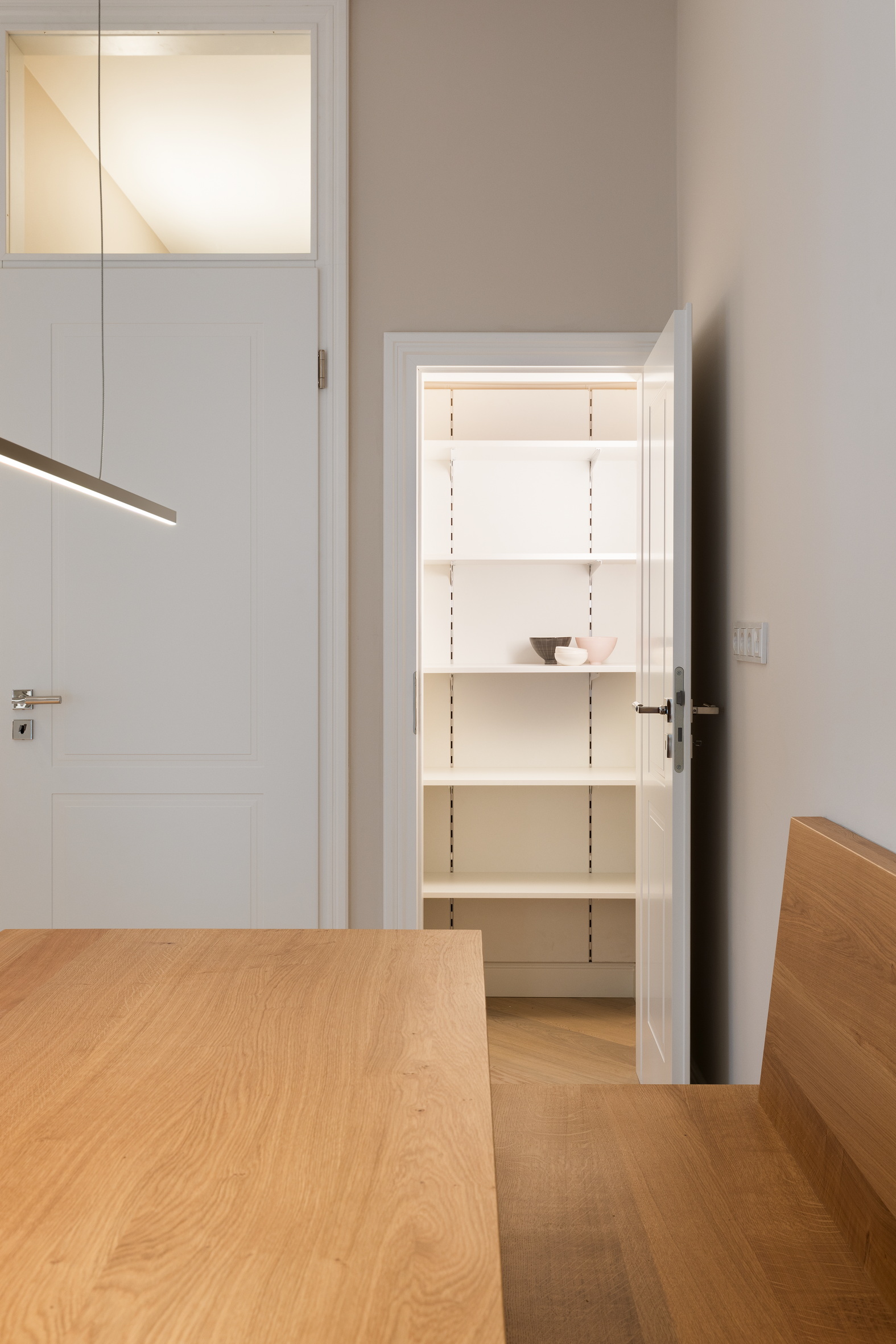 Neu gepflanzte Spalierbäume strukturieren den Außenraum und schaffen geschützte Rückzugsorte. Individuell gefertigte Schreiner-Einbauten ergänzen die Architektur, maximieren den Stauraum und unterstreichen den hochwertigen Charakter des Projekts.